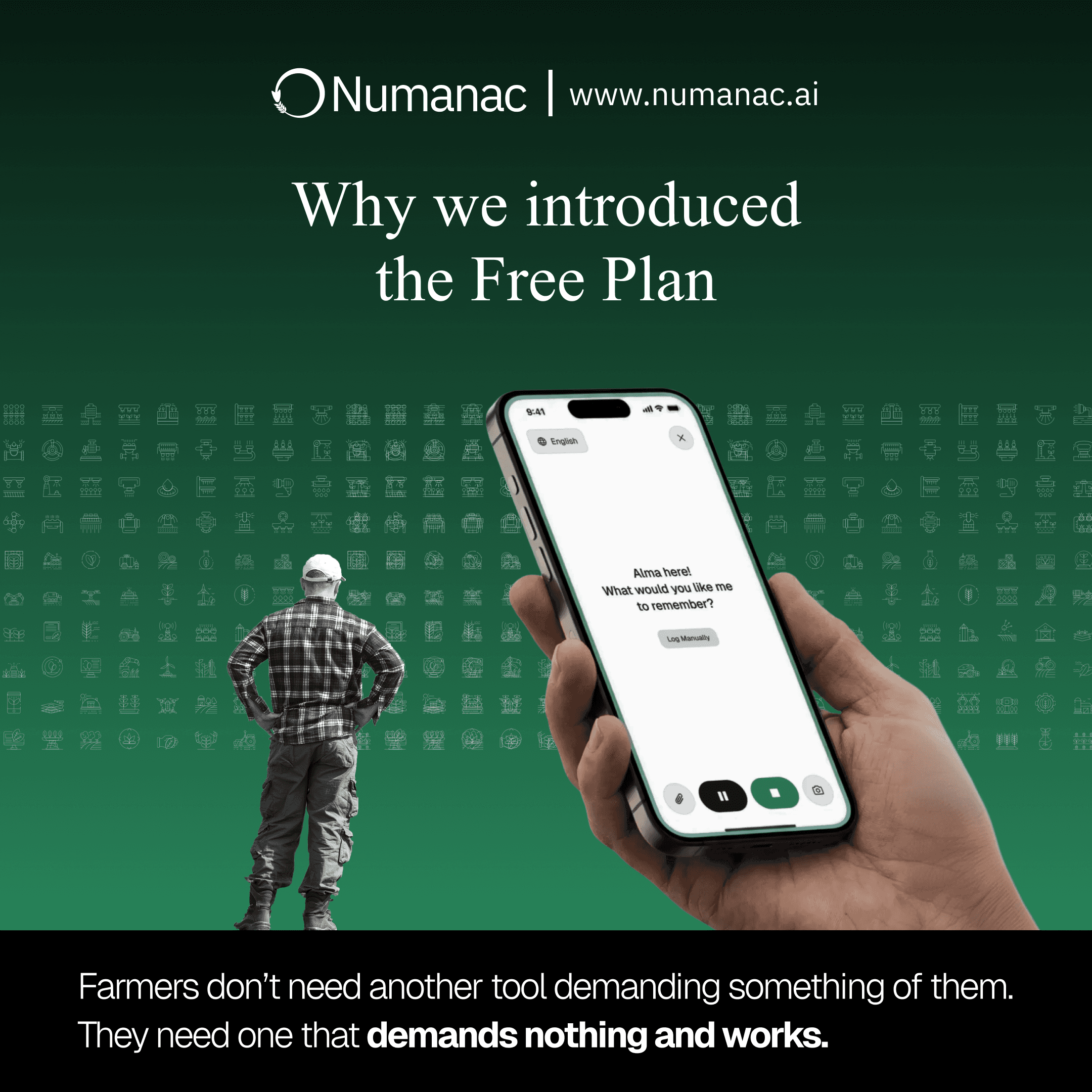 So we made a decision: full logging access is now free. Every farmer, every field team member, every operation regardless of size or tier can capture voice logs, field observations, photos, tasks, and decisions, with automatic geo-tagging, weather context, timestamps, and multilingual support, at no cost. No trial period. No stripped-down version. The thing Numanac does best is now something any farmer can use.